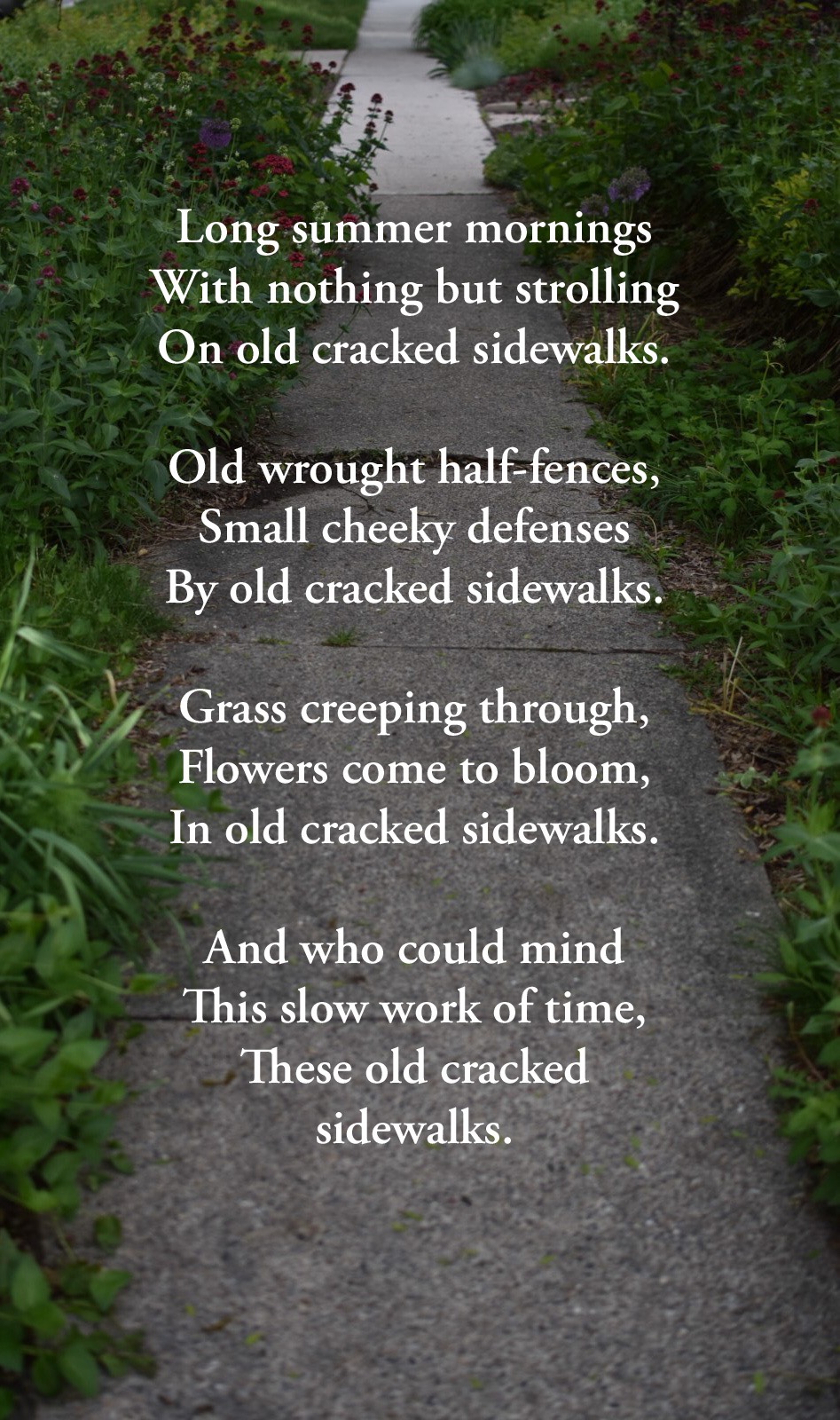Old Cracked Sidewalks Tyler Sherwin Poems May 27, 2019 1 Minute Share this: Share on X (Opens in new window) X Share on Facebook (Opens in new window) Facebook Like Loading... Related Published by Tyler Sherwin View all posts by Tyler Sherwin Published May 27, 2019